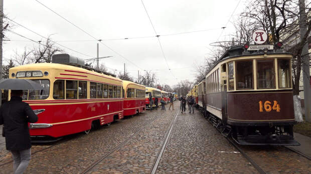 ретротрамваев. Вагоны разных эпох выезжают из гаража, чтобы колонной